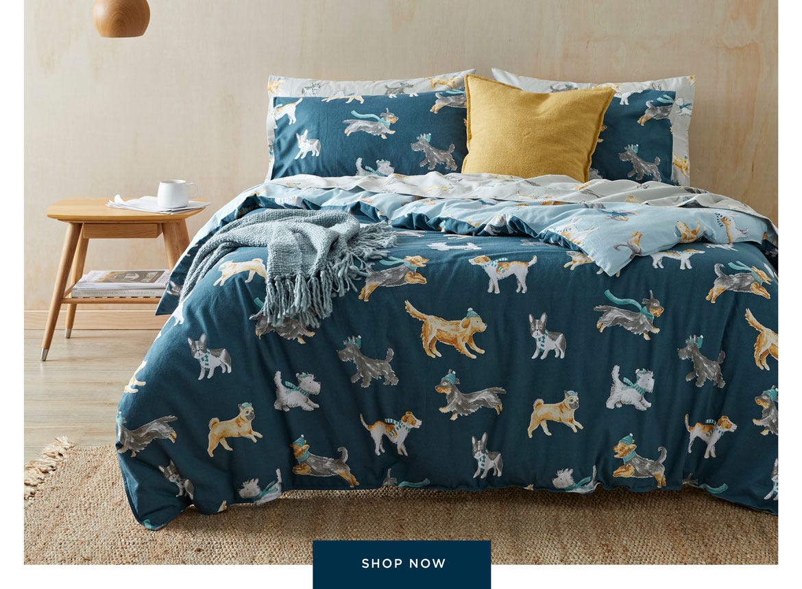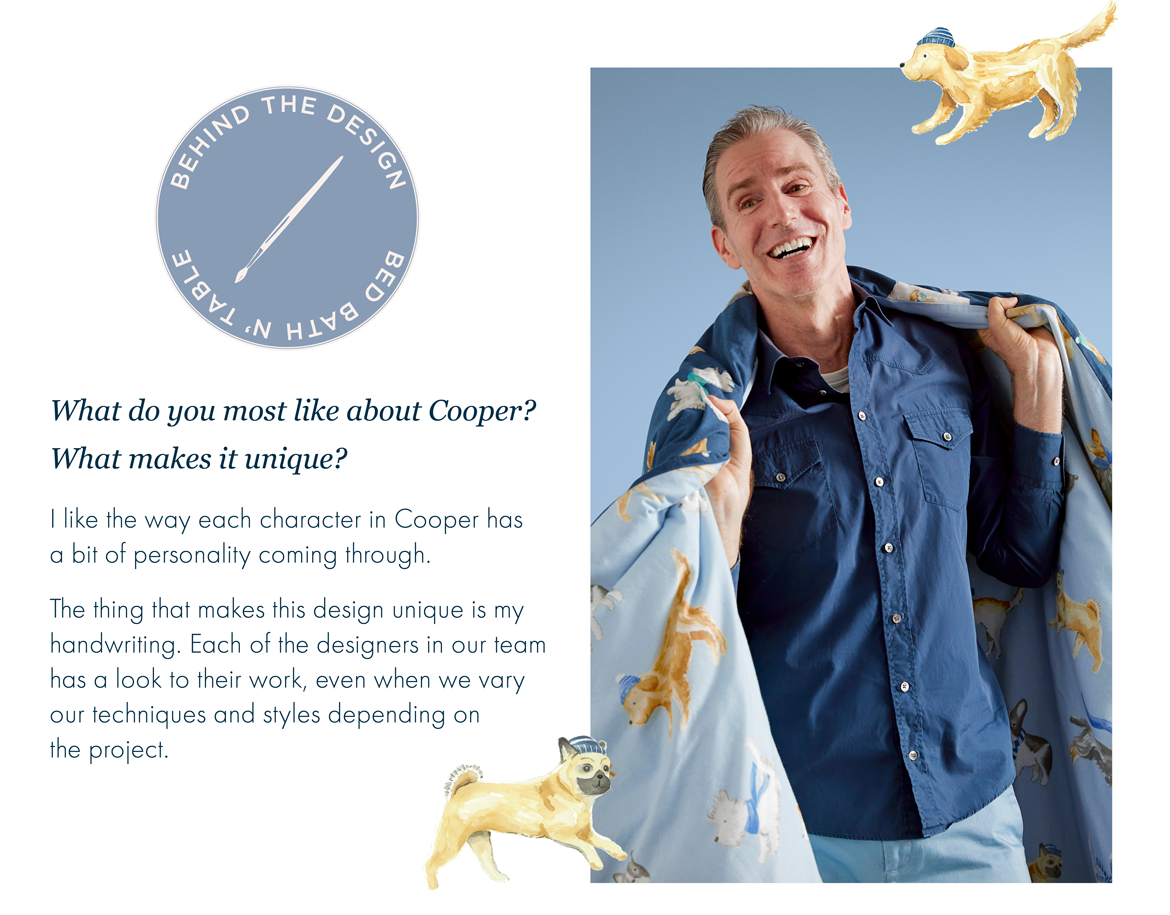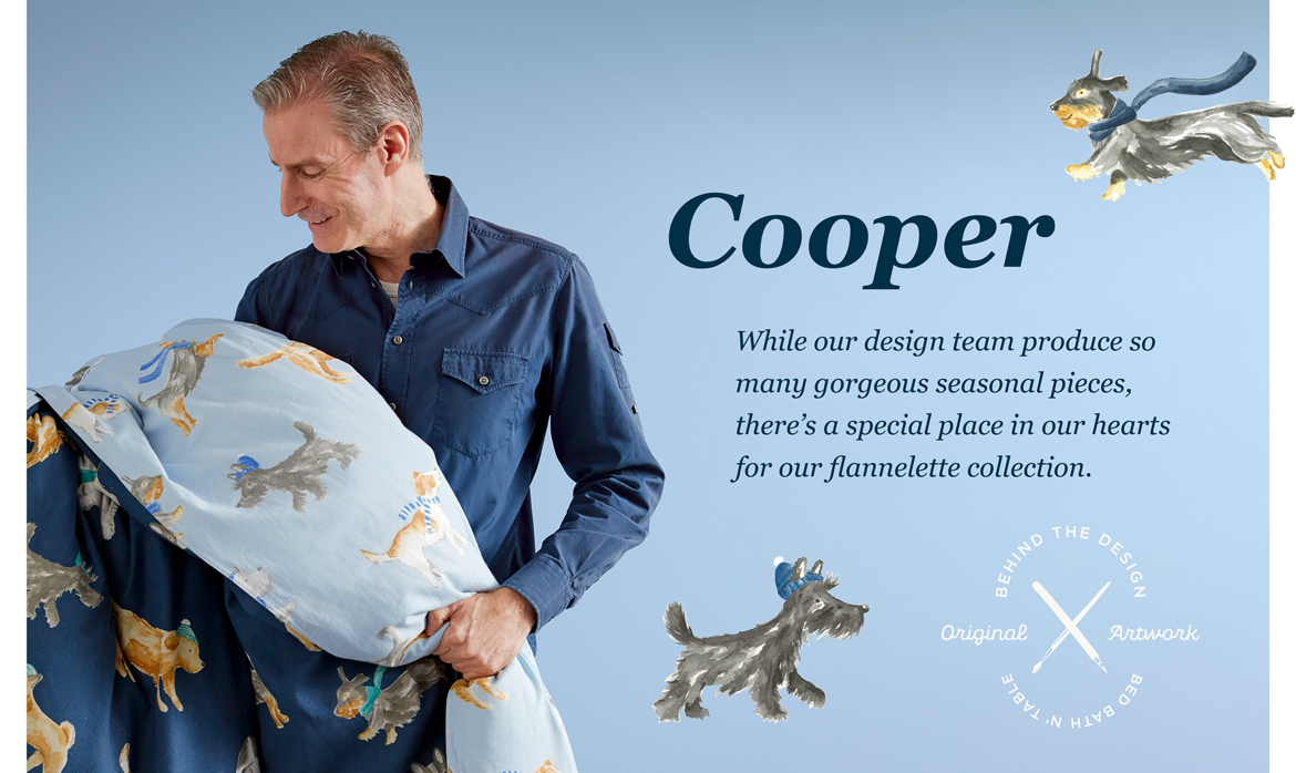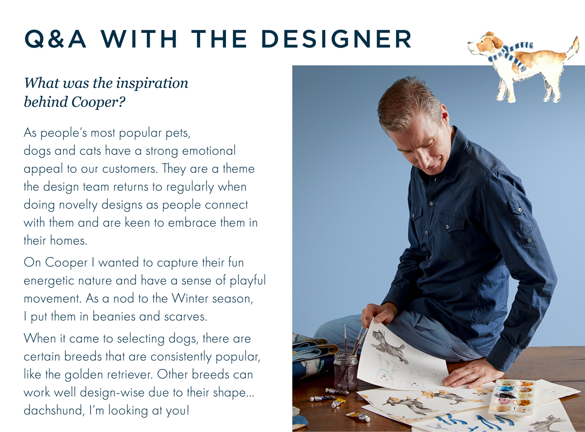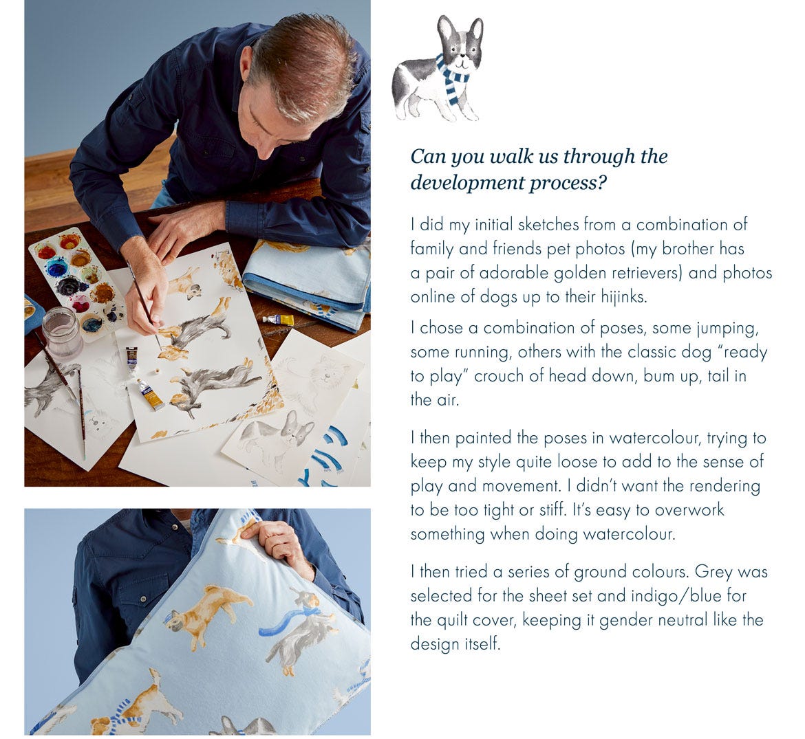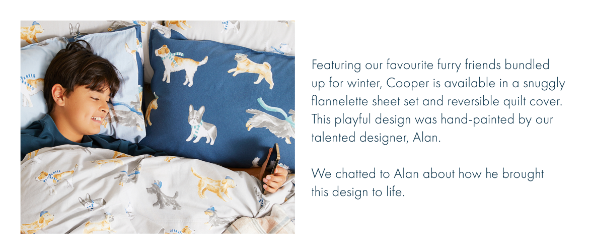 Crafted from brushed flannelette, our Cooper bed linen features playful dogs bundled up for winter. We chatted to the designer about bringing Cooper to life.