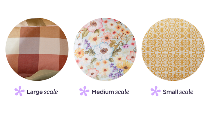 Try to mix geometric patterns such as checks and stripes with organic patterns such as florals. Different pattern types will naturally balance, while similar looking patterns will fight for attention. This also creates visual depth, bringing together flowing, intricate designs and simple geometrics.