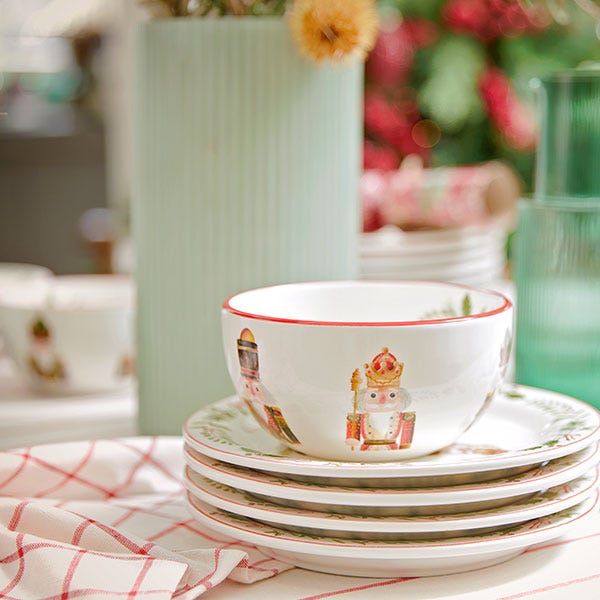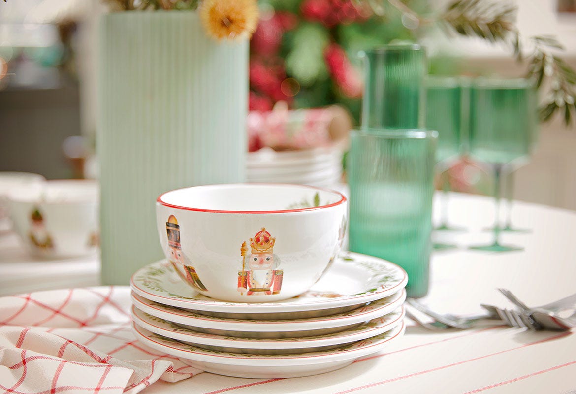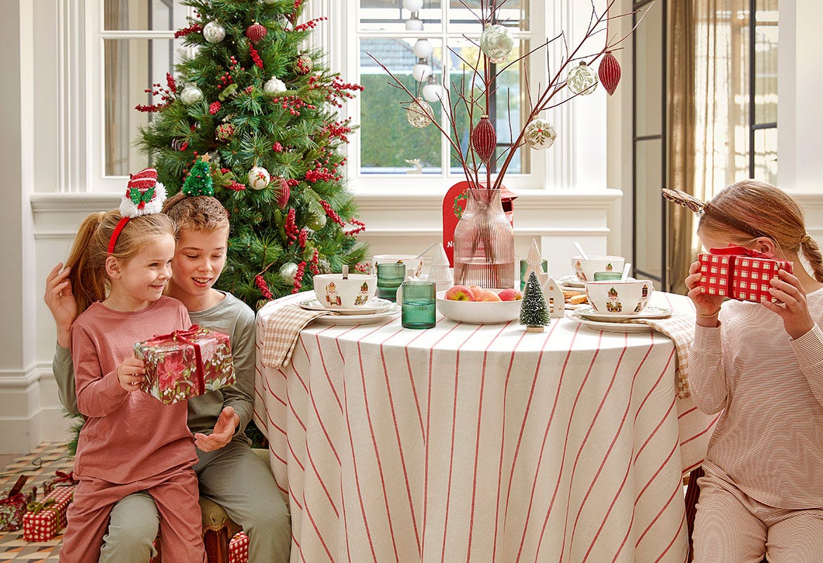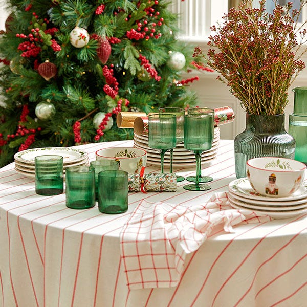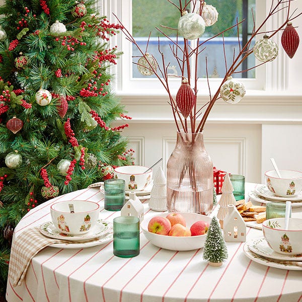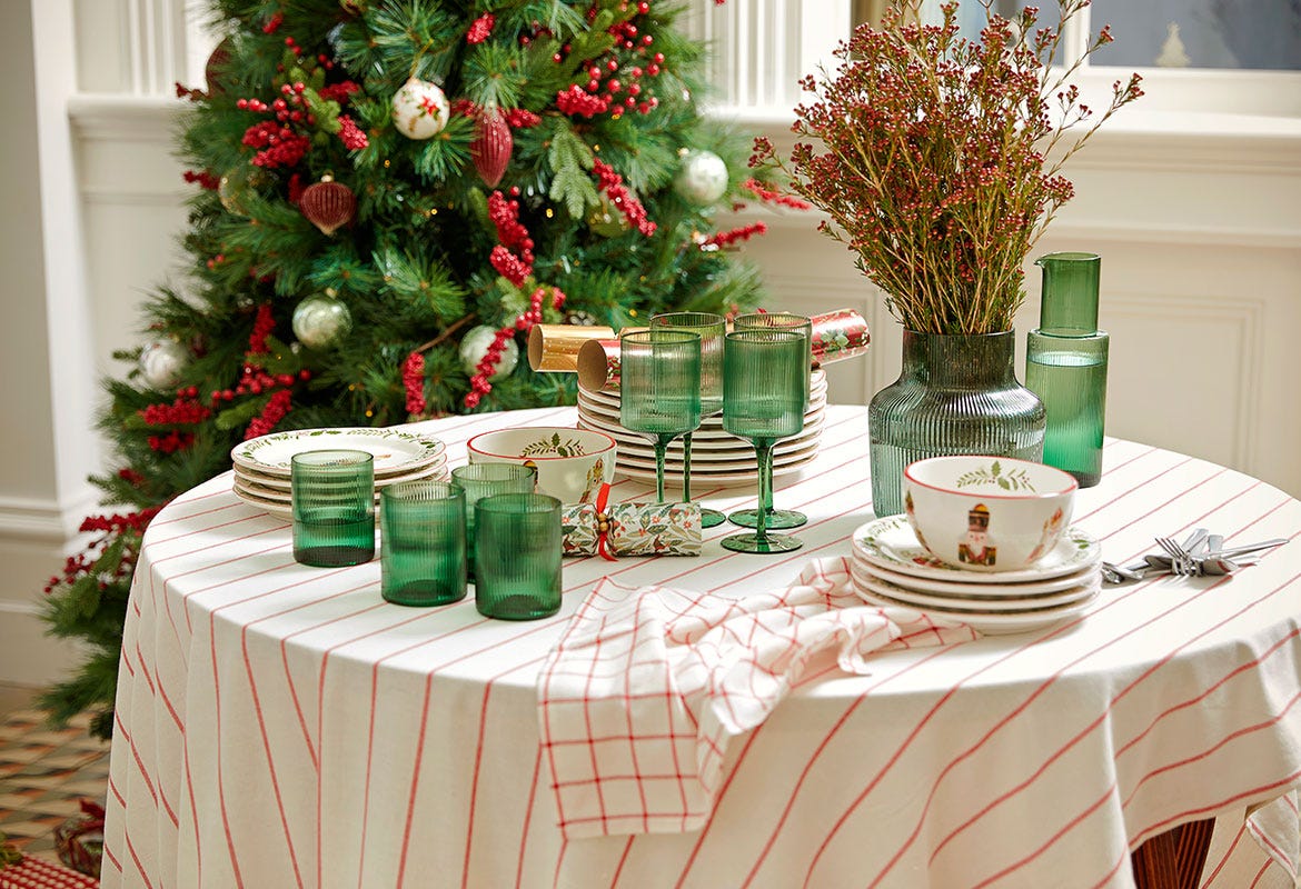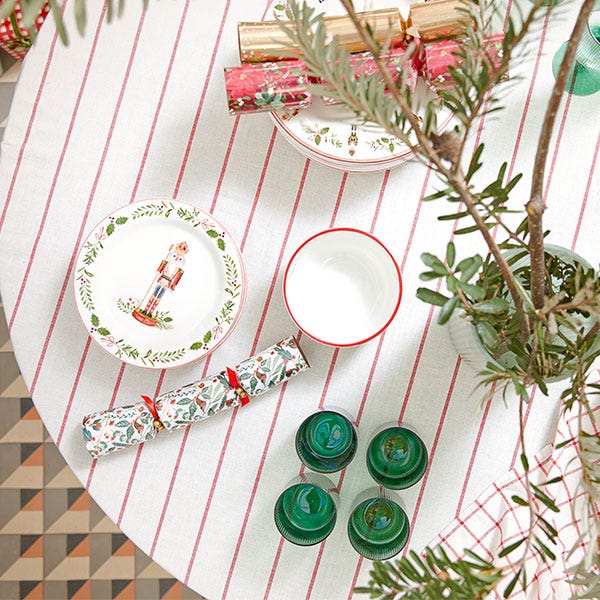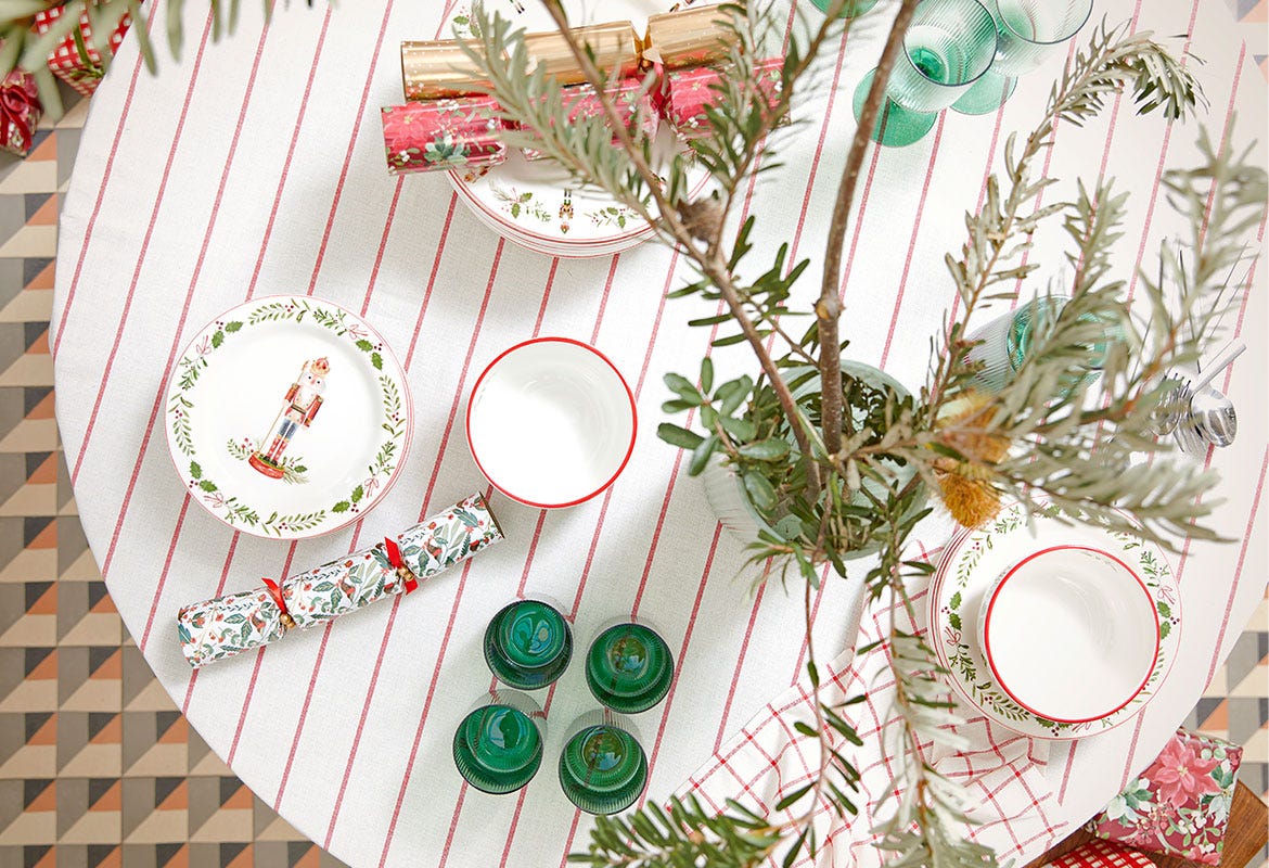 Layering your table linen and crockery is a great way to instantly create an eye-catching, sophisticated style. To keep the look traditional, we’ve used a simple red and white stripe tablecloth as our base and layered with playful Christmas motif plates and bowls for a touch of festive charm. A palette of white, red, and green is continued throughout the table with matching glassware and decorations, keeping the setting consistent and coordinated.
