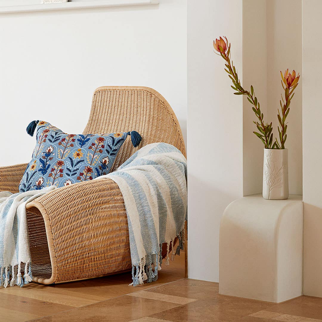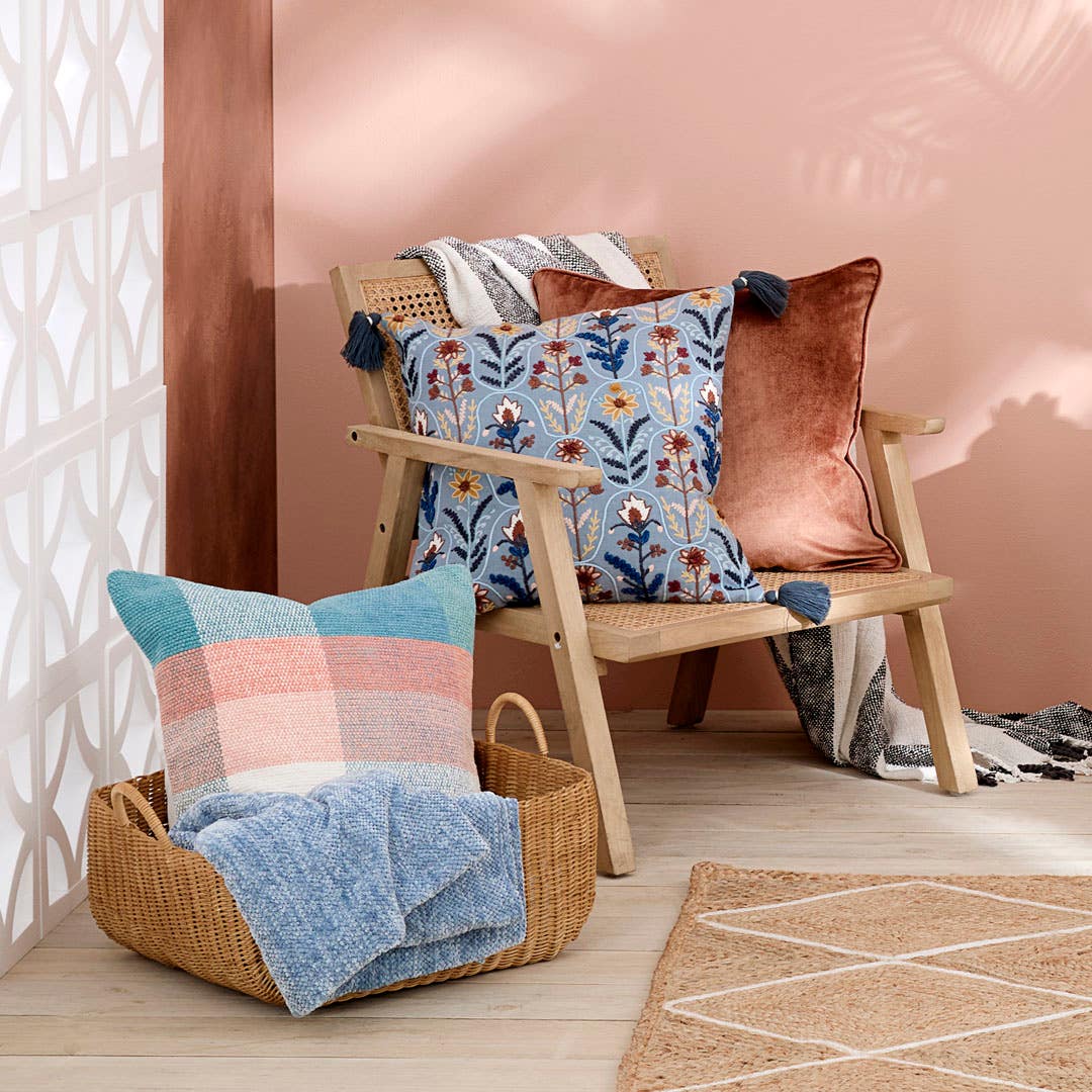 Bring a touch of elegance and texture to your home with the Botany Embroidered Cushion in Blue. Crafted from a cotton blend with stitched detailing and tassel corners, this cushion features an intricate floral design in rich natural shades.