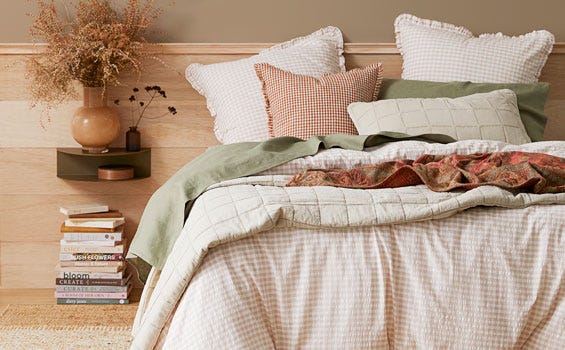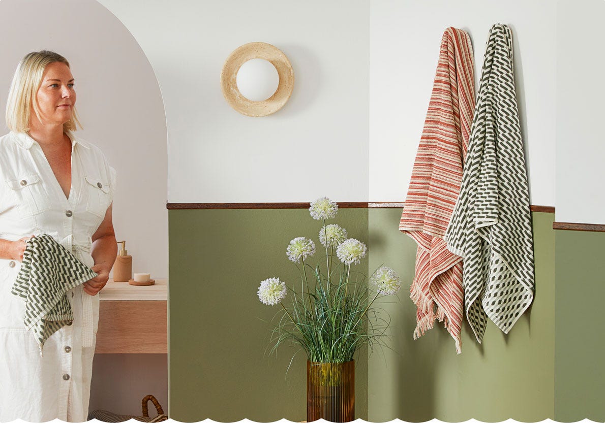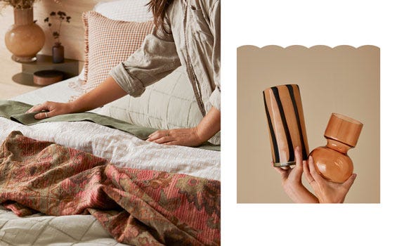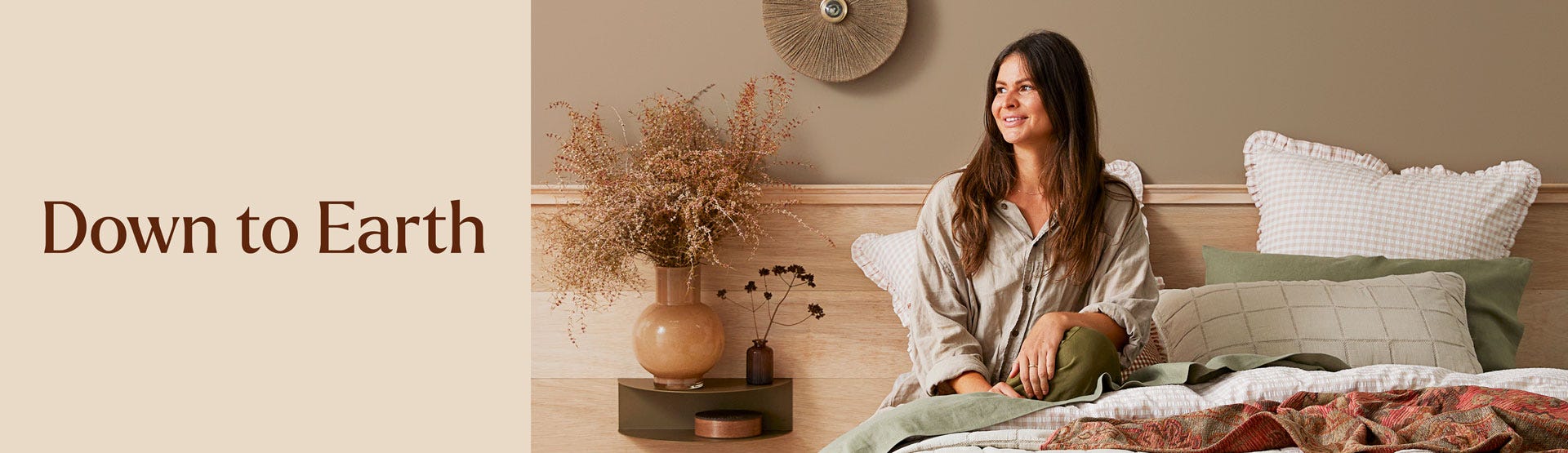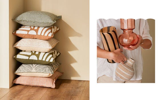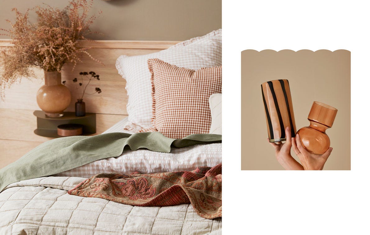 Ground your home styling with earthy tones, natural layers, and hints of pattern. Warm rust and terracotta shades balance with restful olive and sage, inspired by golden autumn days.