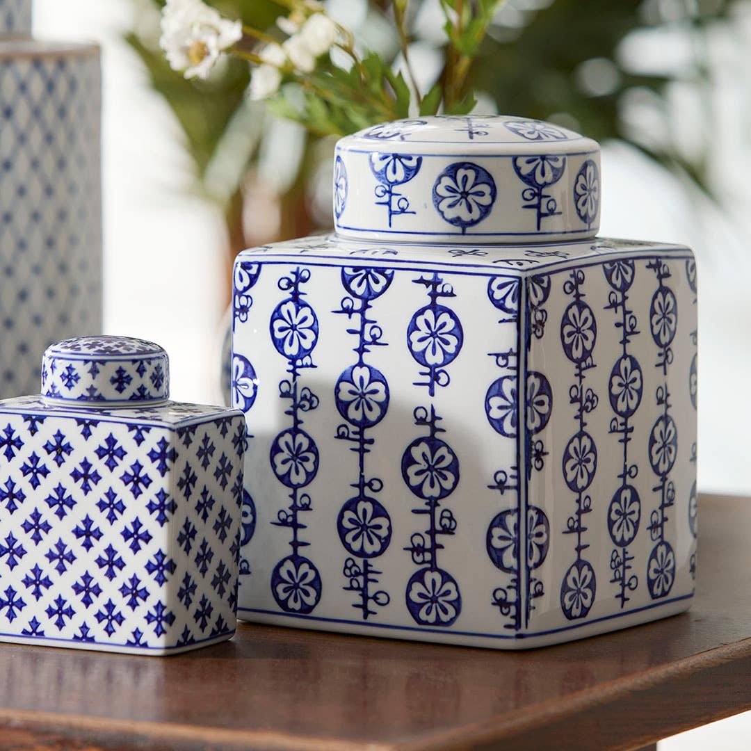 palette of white and blue, this square ginger jar is crafted from stoneware and