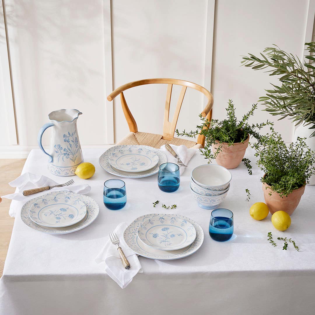 Create a classic and elegant style with the Lucinda dining range. Crafted from stoneware with a soft blue decal print, this blue and white dining set features delicate floral motifs for a decorative touch. Range includes a dinner plate, side plate, bowl, tea cup, pitcher, serving bowl and oval platter - each sold separately.