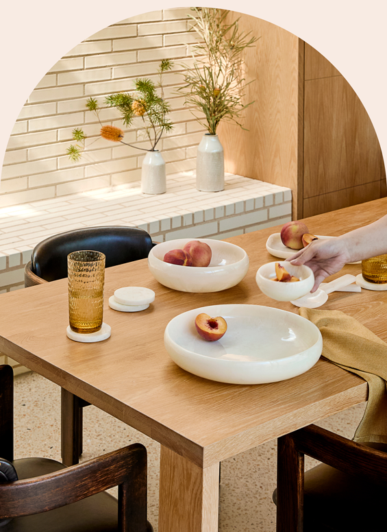 Create a space that feels calm and relaxed. Organic forms and shades pulled from nature come together for a warm and inviting aesthetic.