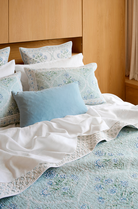 Cool and calm ocean blues create a tranquil bedroom style. Subtle stitched detailing adds comfort and sophistication.