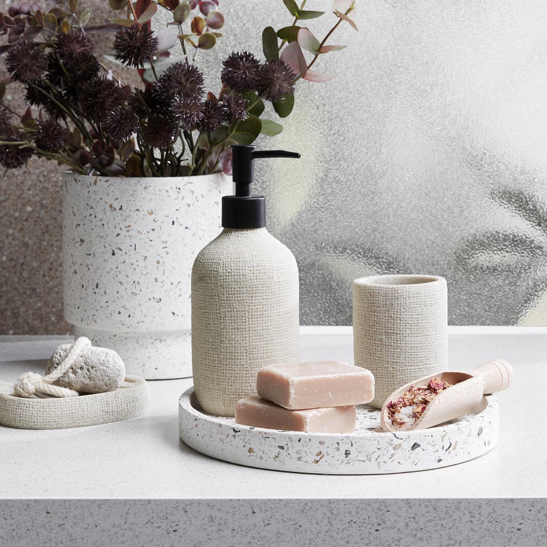 Create a natural style in your bathroom with the Weave Bathroom Accessories. This range features a textured, weave-like pattern in sand tones with black finishes.
