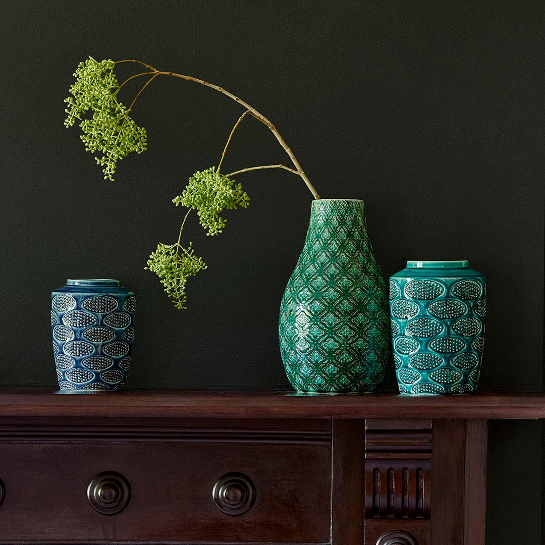 Introduce vibrant colour and decorative detail to your space with the Zinnia Ceramic Vase in Turquoise. Crafted from stoneware, this medium sized vase features a round textural pattern and beautiful glaze for a lovely eye-catching touch.